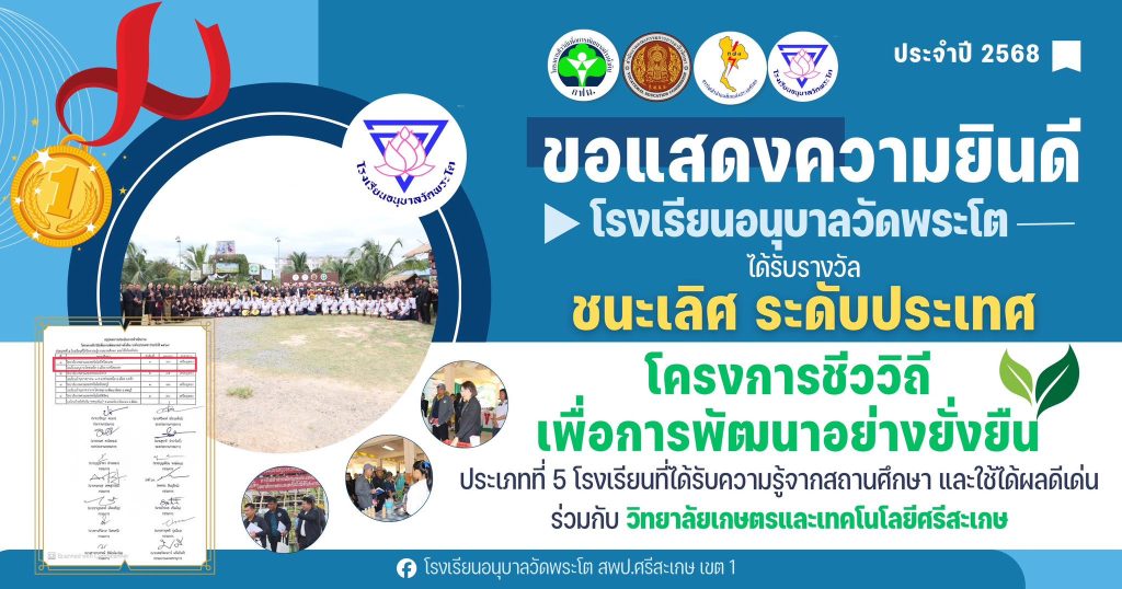 เมื่อวันที่ 27 ตุลาคม 2568 ที่ผ่านมา โรงเรียนอนุบาลวัดพระโตได้รับการประเมินการดำเนินงานโครงการชีววิถีเพื่อการพัฒนาอย่างยั่งยืน ระดับประเทศ ประจำปี 2568 โดยได้รับเกียรติจากหม่อมหลวงชไมทิพ เทวกุล หัวหน้ากองกิจการเพื่อสังคม การไฟฟ้าฝ่ายผลิตแห่งประเทศไทย (กฟผ.) ได้ให้เกียรติร่วมการประเมินในครั้งนี้ ซึ่งมีนายปรัชญา ตะภา ผู้อำนวยการวิทยาลัยเกษตรและเทคโนโลยีมหาสารคาม เป็นประธานคณะกรรมการในการประเมิน
